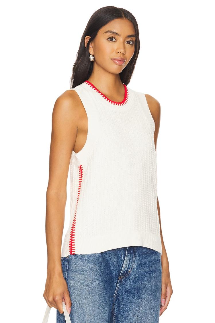 Soft cotton knit texture and a timeless crew neck define this sleeveless tank with a regular fit and hip length hem. The clean white base is accented by subtle red contrast stitching along the neckline and side trims, adding a minimalist yet chic detail. Its strapless sleeve styling enhances the casual appeal, making it perfect for spring to autumn wear. Ideal for everyday errands, brunch dates, or casual outings, this tank pairs effortlessly with denim or layered pieces for versatile styling.
