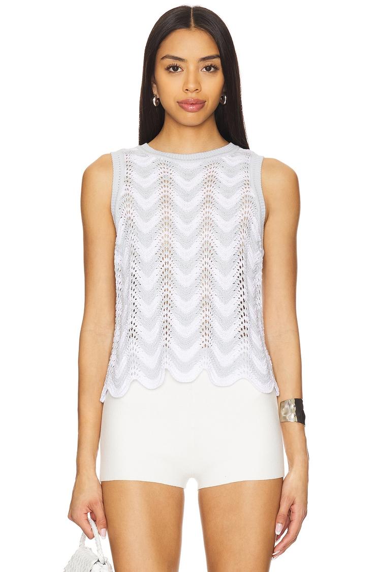 Lightweight cotton knit and a regular fit bring understated charm to this white chevron-patterned tank. Featuring a sleeveless, round neckline and scalloped hem, the semi-sheer fabric adds delicate texture and breathability. Its hip-length silhouette and ribbed trim offer a casual chic vibe perfect for spring and summer outings. Ideal for everyday wear, brunches, and vacation days, this versatile tank combines comfort with minimalistic design for effortless styling.
