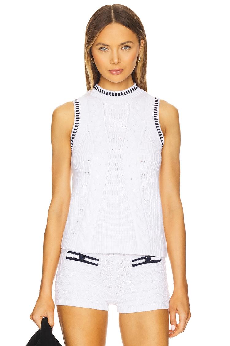Chunky cable-knit texture and a high neckline define this classic white tank top, finished with a sleek black contrast trim for subtle edge. Crafted from breathable 100% cotton, its sleeveless design and hip length make it ideal for spring and summer days. The regular fit and pullover style ensure comfort and ease, perfect for casual outings, brunch dates, or everyday wear. Combining timeless minimalism with modern detailing, this tank blends cozy knitwear with versatile style.