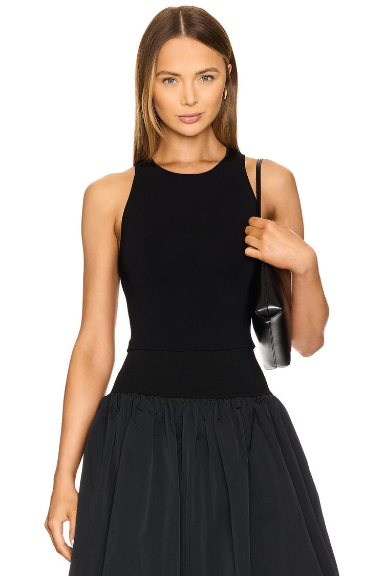 A sleek matte black fitted tank top crafted from a midweight ponte fabric blend of rayon, nylon, and elastane. Featuring wide straps and a classic crew neckline, its sleeveless and waist-length silhouette offers a minimalist and sophisticated look. The covered back adds to its clean lines, making it perfect for versatile styling from casual days to workwear and business casual settings, as well as brunch outings. This modern staple combines comfort with elegance, ideal for all seasons and effortless layering.