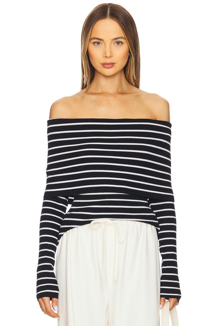 Heavyweight ribbed knit fabric defines this off-shoulder shell top featuring a foldover neckline and long sleeves for a timeless silhouette. The regular fit and hip length ensure comfort and versatility, making it perfect for casual outings, workwear days, or weekend brunches. Crafted from a luxurious blend of merino wool and polyester, this striped black and white top offers warmth with an elegant minimalist style that transitions seamlessly through autumn and winter seasons.
