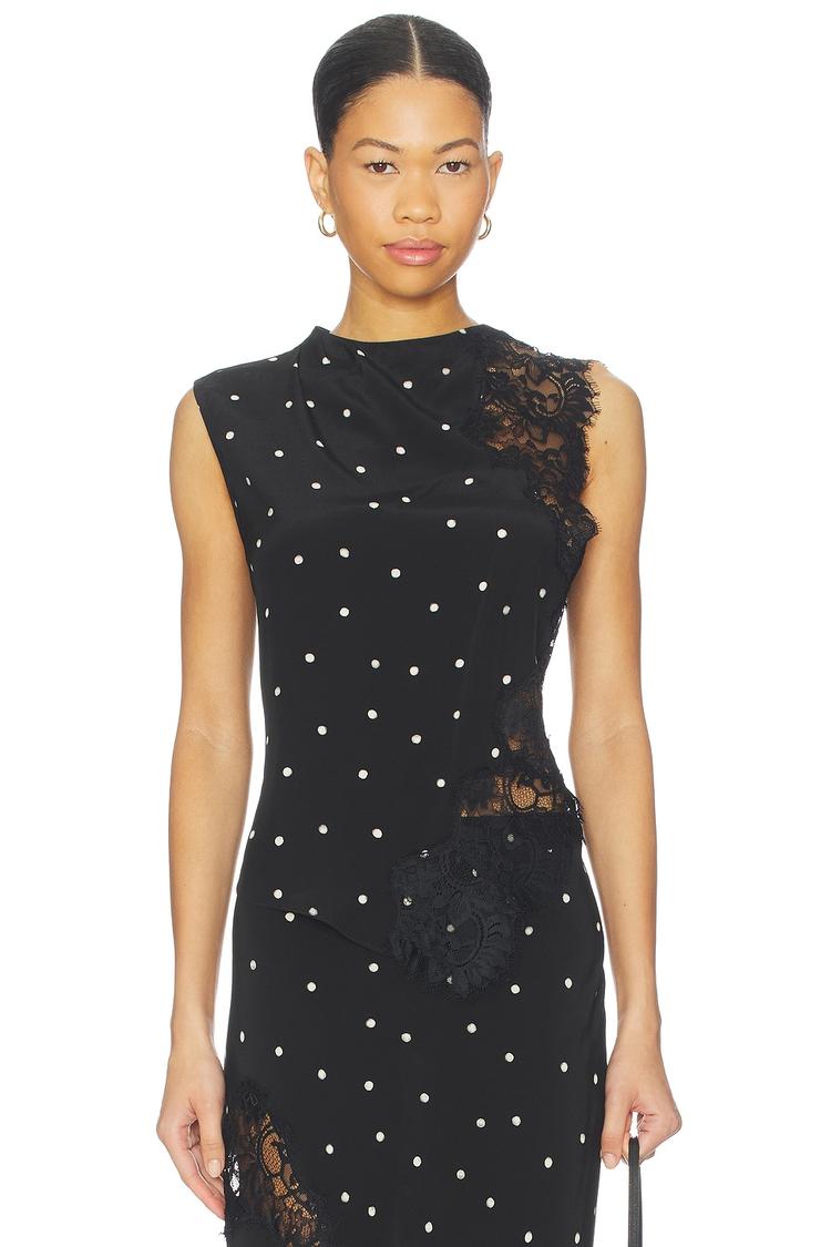 Matte black crepe shell top adorned with delicate lace panels and subtle white polka dots creates an elegant silhouette. The fitted hip-length design features a sleeveless cut and a high neckline with button loop closure, perfect for cocktail parties, semi-formal events, or night outs. Lightweight nylon fabric ensures comfort and sophistication, while hidden side zipper closure maintains a sleek finish. This refined top pairs beautifully with tailored skirts or pants for a polished and sophisticated look.