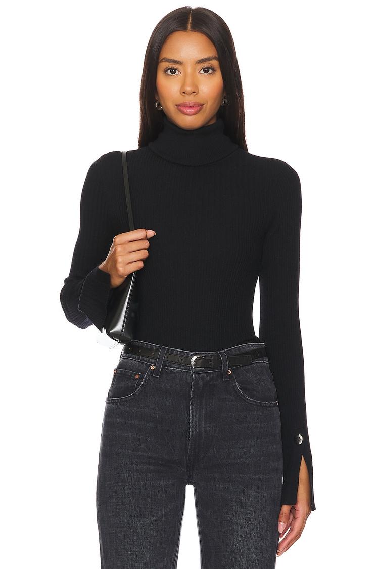 Rib knit fabric and a sleek fitted silhouette define this matte black shell with a classic turtle neck and long cuffed sleeves featuring button details. The hip-length cut enhances its minimalist chic appeal, making it a versatile choice for casual outings, workwear, and business casual settings. Crafted from a warm wool-polyester blend, this top provides both comfort and style during autumn and winter seasons. Its clean lines and subtle design details create an elegant foundation for layering or standalone wear, perfect for those who appreciate timeless, refined wardrobe essentials.