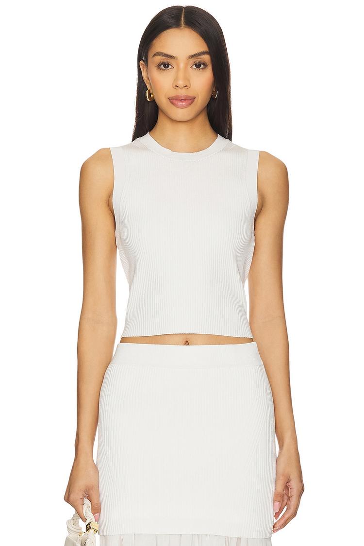 Heavyweight ribbed knit fabric defines this fitted cropped tank top in crisp white. Featuring a classic crew neck and wide straps, it offers a sleek and minimalist silhouette perfect for warmer seasons. The pullover design and semi-sheer texture add a modern touch to this versatile piece. Ideal for casual days, brunches, and everyday wear, this top pairs effortlessly with high-waisted skirts or pants, balancing comfort and style with its breathable rayon-nylon-elastane blend.
