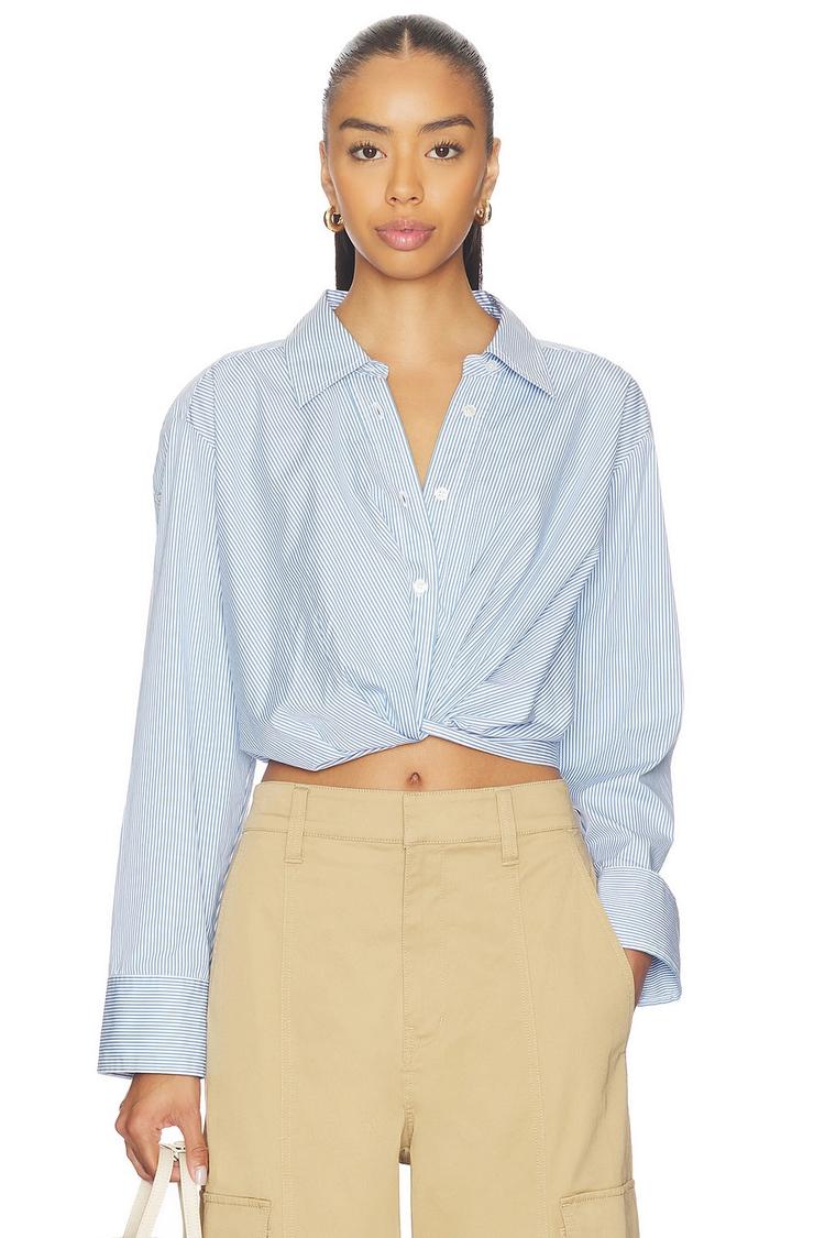 Light blue cotton poplin brings a fresh and airy feel to this cropped blouson top, featuring a relaxed fit and a classic collar neckline. The long sleeves end with buttoned cuffs, while a ruched front and elasticized waistband add subtle texture and shape to the silhouette. Its button closure front enhances functionality, making it ideal for casual outings, brunch dates, and business casual settings. This versatile piece is perfect for spring through autumn, combining comfort with minimalist style for a polished yet effortless look.