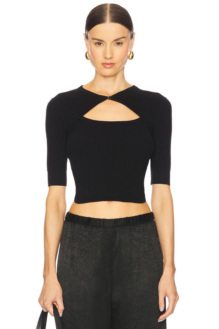 A sleek cropped shell top in classic black features a distinctive keyhole neckline and elbow-length regular sleeves. The fitted silhouette accentuates the waist, complemented by a detached shrug with loop button closure adding versatile style options. Crafted from a midweight textured jersey blend of cotton and nylon, this piece balances comfort with structure. Ideal for casual outings, brunch dates, or night out occasions, its tie-back closure enhances the modern, minimalist aesthetic while ensuring a secure fit. A contemporary essential that pairs effortlessly with high-waisted bottoms for a chic seasonal look.