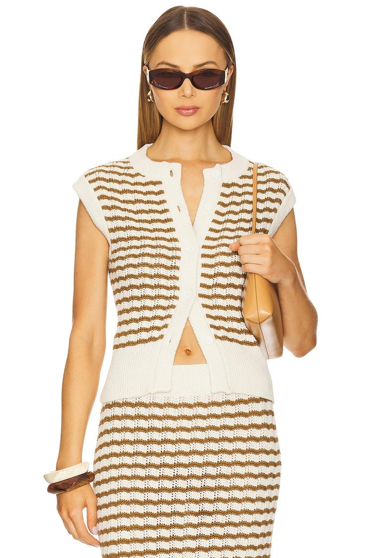 A relaxed silhouette and classic striped knit fabric define this sleeveless shell top with cap sleeves and a round neckline. The front button closure and ribbed trim add subtle texture and refinement, while the cream base with brown stripes brings a timeless palette. Crafted from a cotton-polyester blend, this hip-length top offers breathable comfort for spring and summer days. Versatile for casual outings, brunch dates, or polished workwear looks, it pairs beautifully with skirts or trousers to create minimalist, chic ensembles.