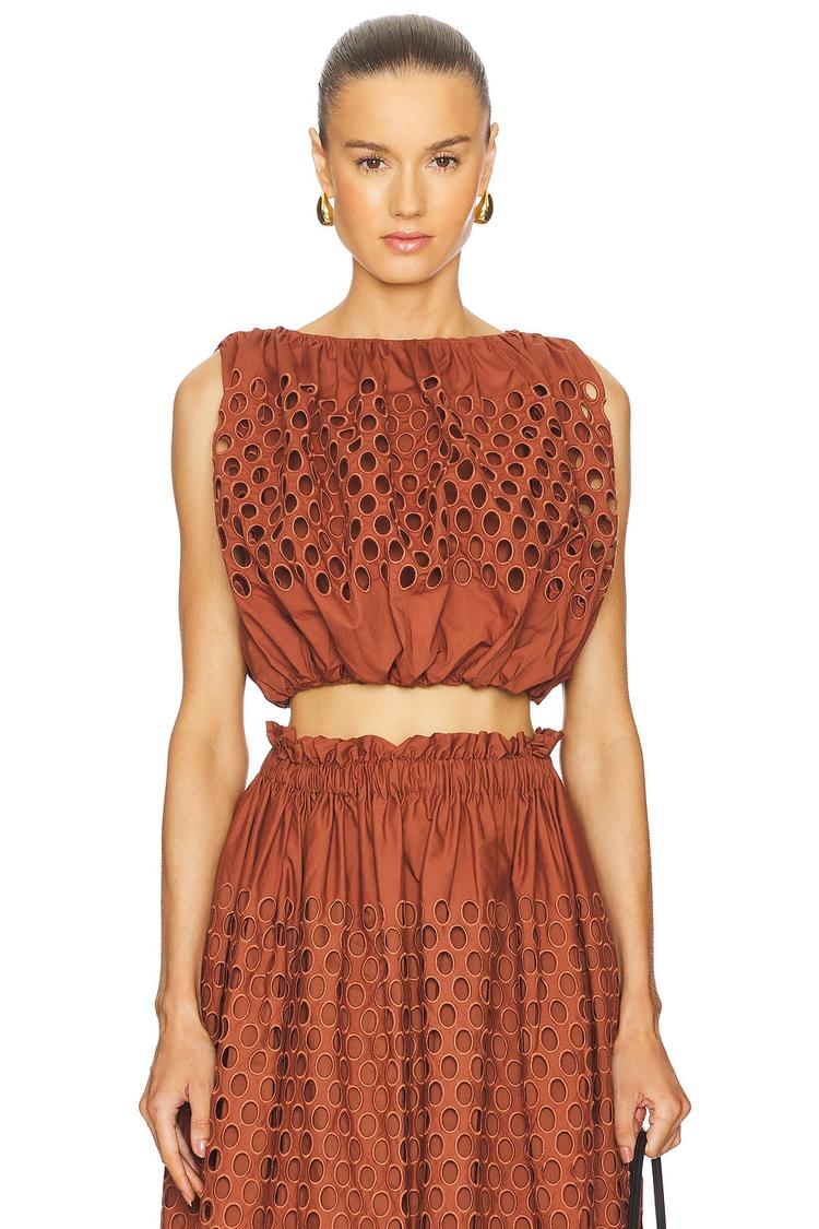 Intricately crafted with eyelet embroidery all over, this relaxed fit cropped top in matte rust cotton offers a breezy sleeveless silhouette with a classic round neckline. The ruching at the hem and the back button closure add charming details, making it perfect for casual outings, brunch dates, or relaxed evenings. Fully lined for comfort, this versatile piece blends bohemian flair with casual chic style, ideal for spring through autumn wear.