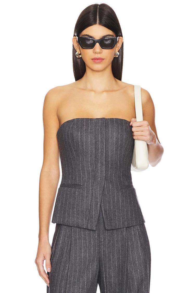 A structured corset top crafted in a soft wool-cashmere blend with a sleek twill texture and subtle pinstripes. The fitted silhouette, straight strapless neckline, and boned bodice offer a refined, elegant look, while front flap pockets add a chic detail. Finished with a hidden side zipper, this hip-length piece is perfect for cocktail parties, night outs, or date nights during cooler autumn and winter months. Its sophisticated design and luxurious fabric blend make it a standout choice for modern, polished dressing.