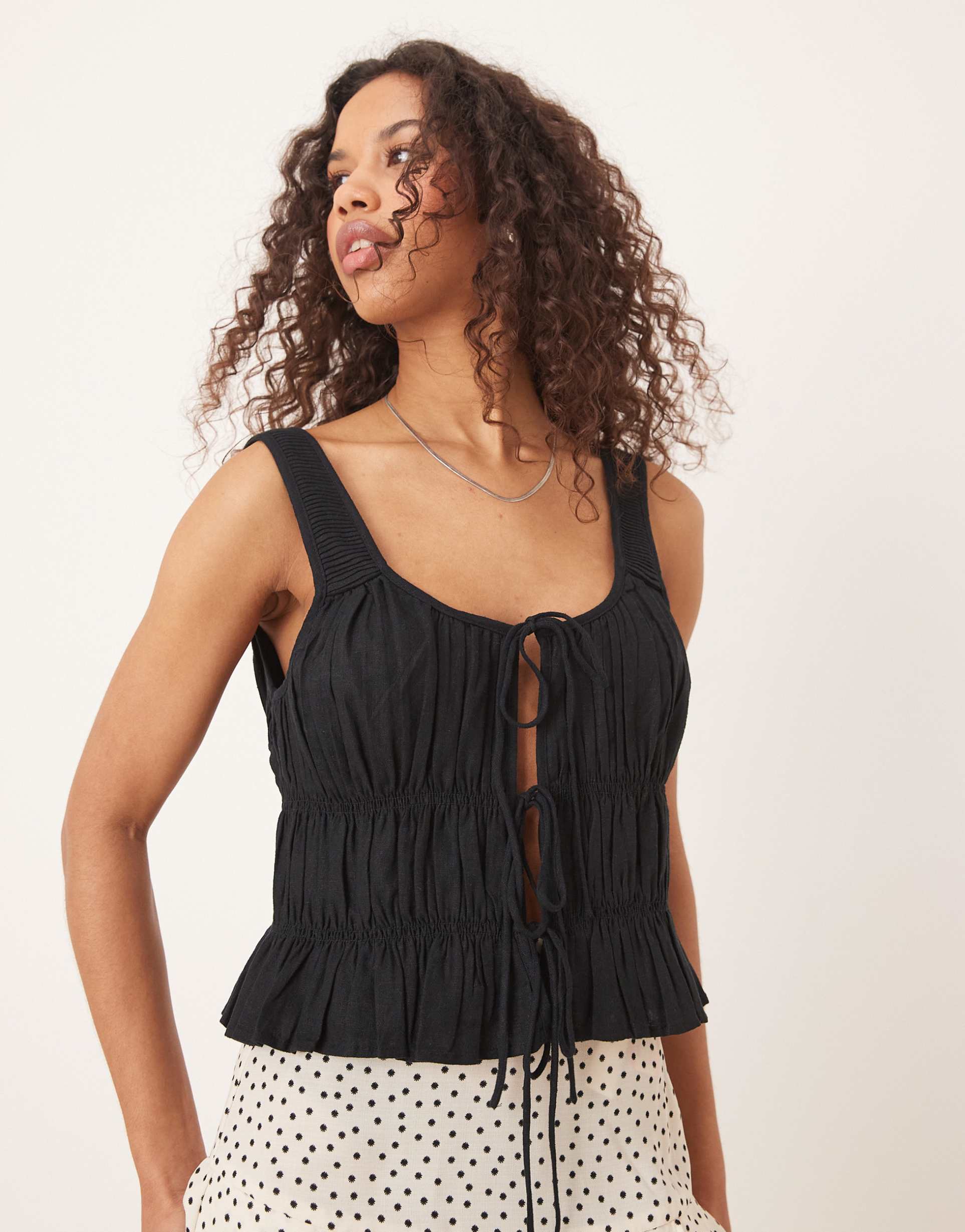 Soft matte black fabric with a breathable linen-viscose blend brings effortless comfort to this sleeveless tank top. Featuring a flattering scoop neckline and wide straps, it showcases elegant ruching details on the front with a tie-up closure for adjustable fit. The waist-length silhouette and regular fit make it a versatile piece for casual outings, everyday wear, or a relaxed brunch. Its minimalist design and lightweight texture offer a perfect mix of style and ease for warm spring and summer days.