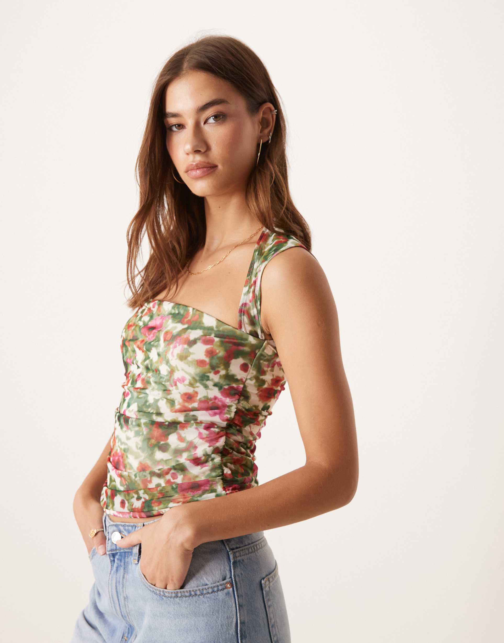 ABERCROMBIE & FITCH SQUARE NECK RUCHED SLEEVELESS TOP IN FLORAL