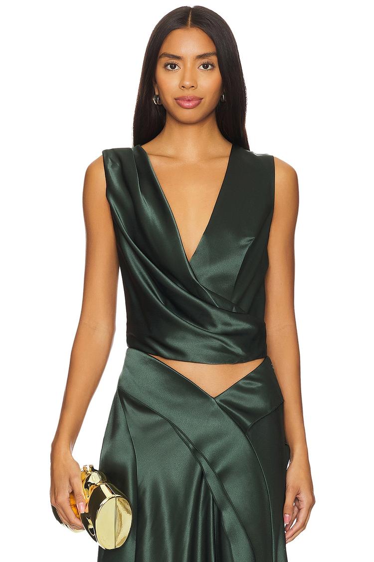 Satin texture and a fitted silhouette define this cropped top featuring a sleeveless cut and a sophisticated surplice neckline. Draped detailing at the front and an elastic hem add dimension and comfort, while the covered back offers a sleek finish. Its deep olive matte green hue enhances its elegant appeal, making it a versatile choice for cocktail parties, night outs, and romantic date nights. The pullover closure ensures easy wear, and the all-weather suitability broadens its use across seasons.