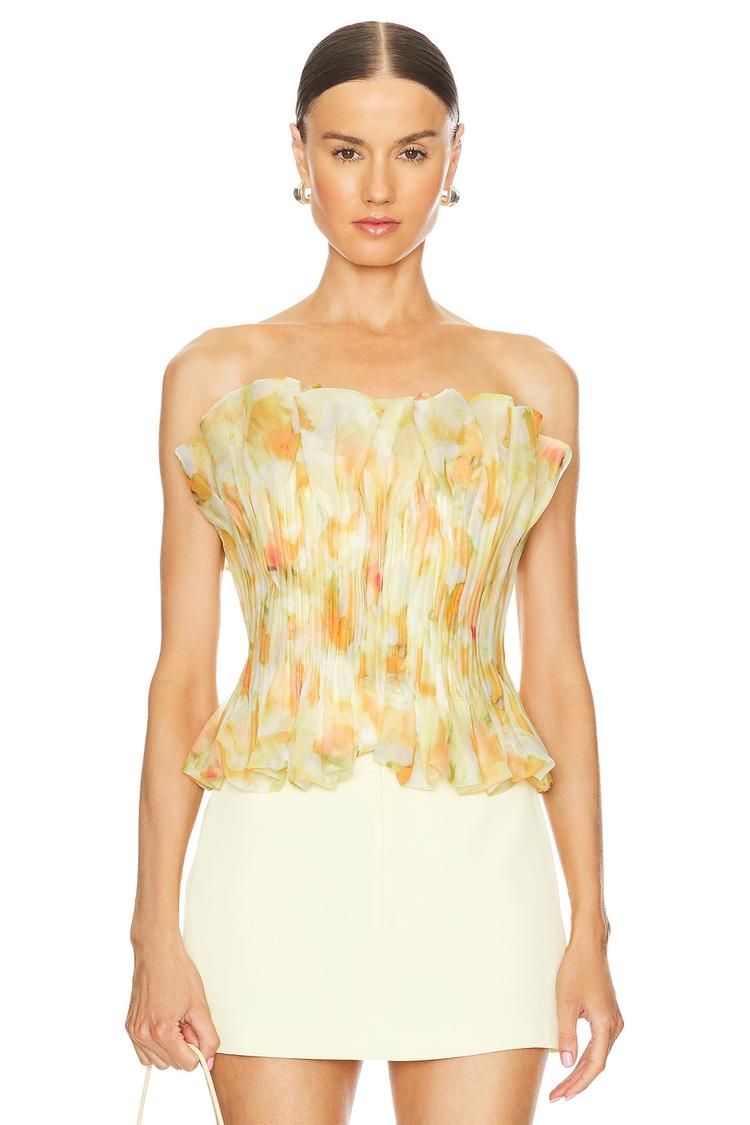 Delicate pleated organza shapes this fitted bandeau top with a straight neckline and strapless sleeveless design. The waist length silhouette features a soft abstract print in creamy, peach, and yellow tones, creating a fresh and elegant look. An exposed back zipper ensures a sleek finish, while the boned bodice adds structure and sophistication. Ideal for spring and summer, this chic top suits cocktail parties, semi-formal events, and night outs with its modern vibe and refined detailing.