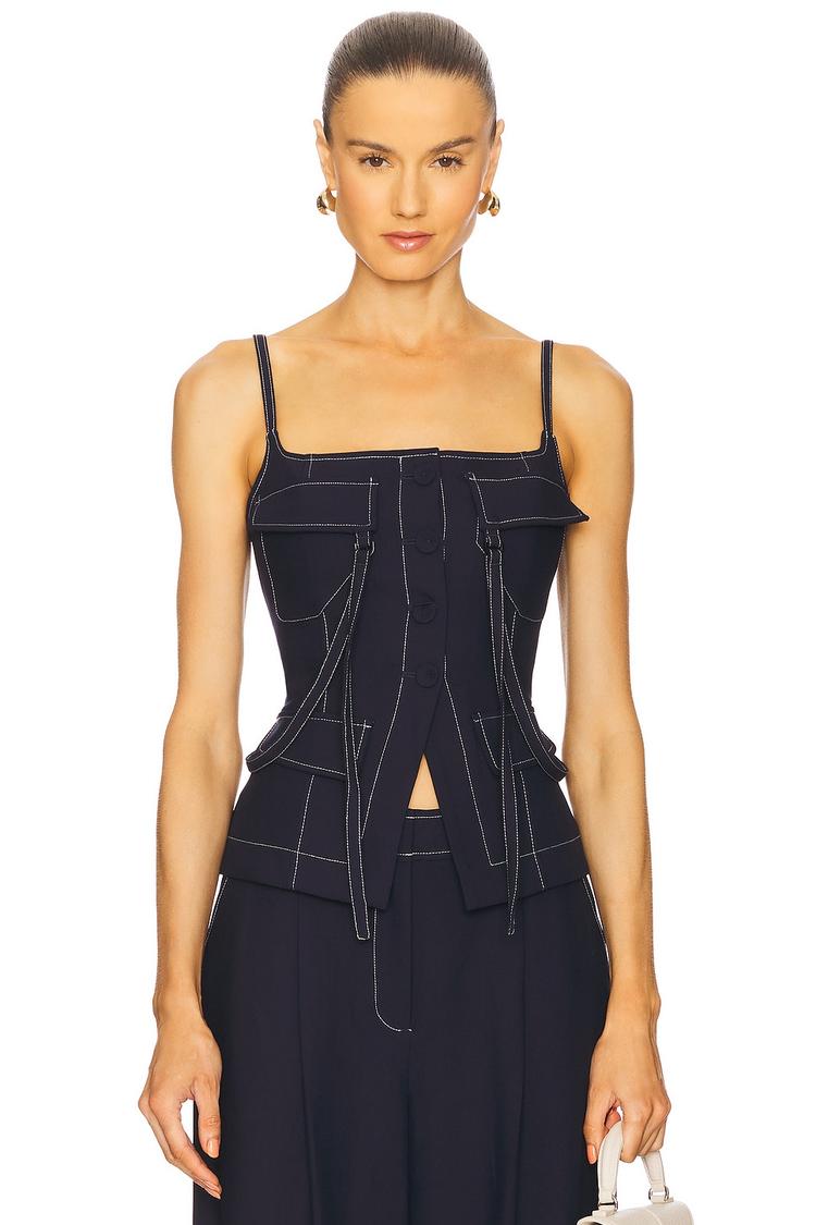 Structured in a matte deep sapphire twill fabric, this fitted corset top features a sophisticated square neckline and delicate spaghetti straps. The front button closure and four-pocket styling add modern utility and chic detail, while the hip-length cut flatters the silhouette. Its versatile design makes it ideal for casual outings, brunch dates, and night outs, combining fashion-forward style with classic tailoring for a confident, polished look.