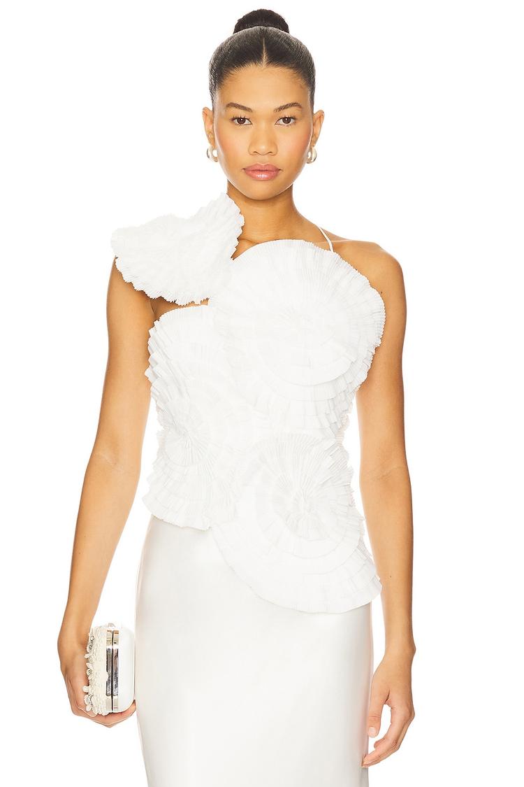Soft draping and sculptural ruffles define this elegant camisole crafted in luxurious silk. The strapless neckline and fitted silhouette offer a sophisticated shape that flatters the figure, while the hip length provides a polished finish. Ideal for cocktail parties, formal events, or a night out, this top pairs beautifully with sleek skirts or tailored trousers. Its modern design and pristine white hue make it a standout piece for semi-formal occasions and date nights, combining refined style with a touch of artistic flair.
