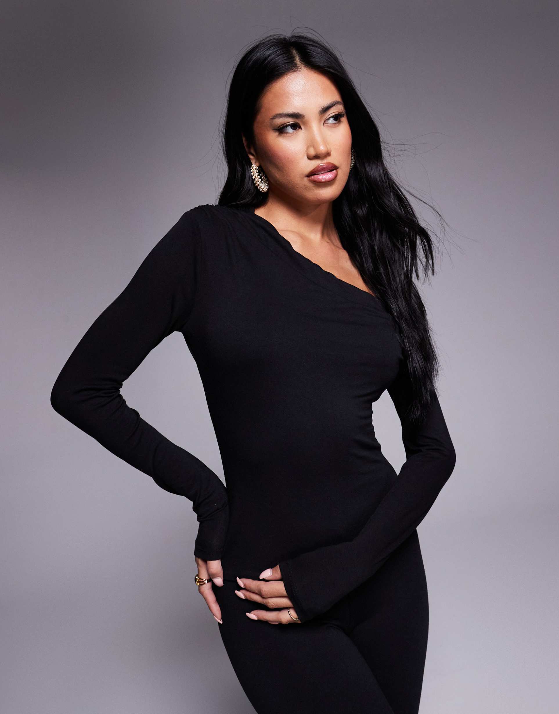 The sleek off-shoulder neckline and long sleeves create a captivating silhouette in this slim fit hip-length top. Crafted from a soft and stretchy rayon-elastane jersey blend, it offers comfortable wear with a minimalist aesthetic. Ideal for casual outings, date nights, or girls' nights, this versatile black wrap-style top pairs effortlessly with a variety of looks, making it a chic addition to autumn, winter, and spring wardrobes.