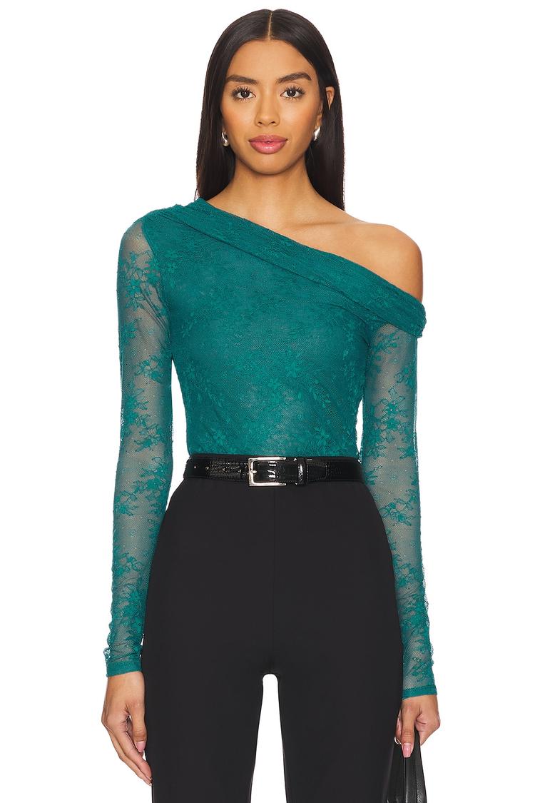 Soft ruched lace fabric and a sleek fitted silhouette define this asymmetric off-shoulder top in a matte dark teal hue. The long sheer sleeves add an elegant, modern touch while maintaining a sexy vibe. Crafted from nylon and elastane, it offers a comfortable stretch that moves with you. Waist-length and perfect for layering, this chic top is versatile enough for casual outings, date nights, and stylish evenings out. Its sheer panels and ruched detailing create a delicate yet confident statement piece for your wardrobe.