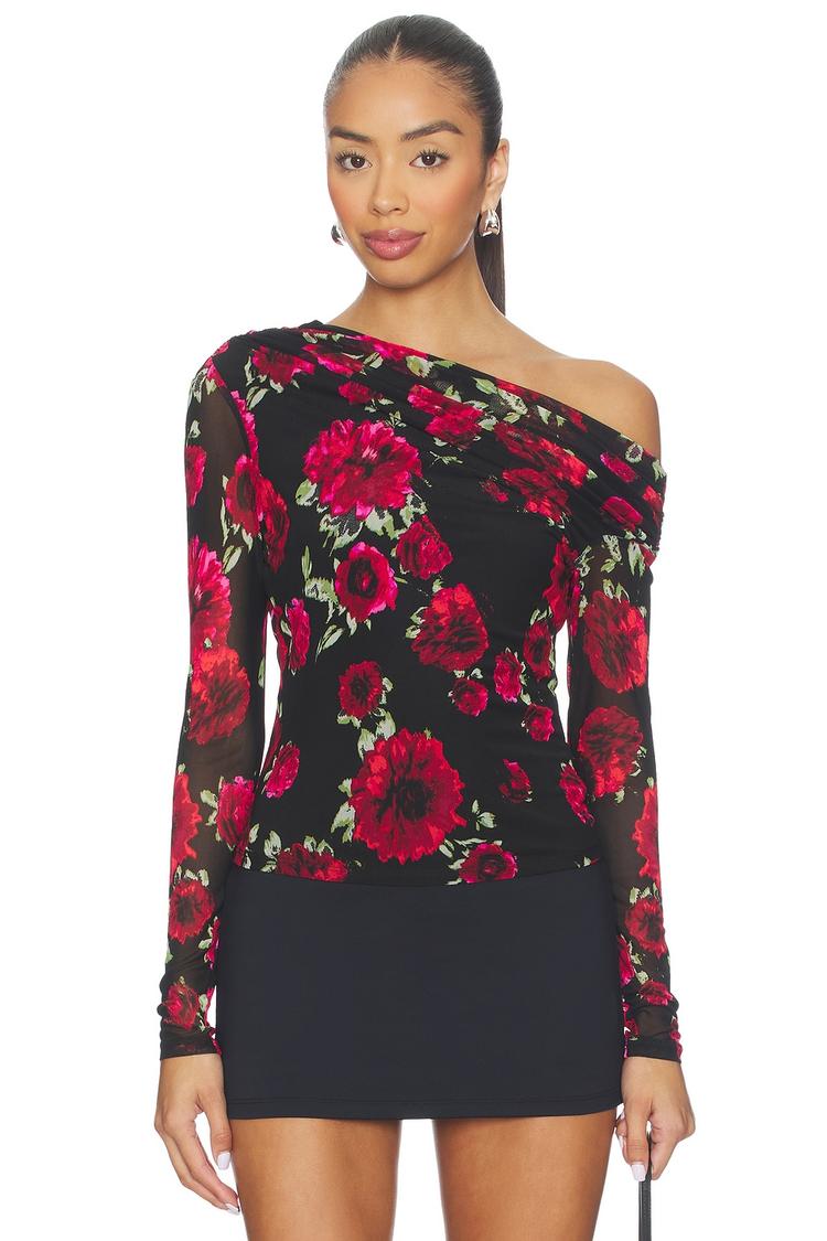 Soft sheer fabric with a smooth bodice lining shapes this off-shoulder long sleeve top featuring a bold red floral print against a black base. The slim fit silhouette is enhanced by elegant ruching at the front and back collar, creating a flattering neckline that transitions into regular sleeves. With a pullover closure and waist-length hem, this trendy top blends sexy appeal with comfort. Ideal for casual days, night outs, or date nights, it offers versatile style with a hint of floral romance and a modern edge.