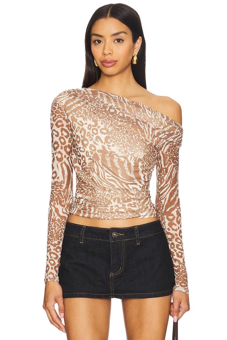 Midweight ruched mesh fabric and a fitted silhouette define this cropped top with a daring off-shoulder neckline and long sleeves. The all-over animal print in beige and brown tones adds a trendy, street style edge, while the ruching at the front and back enhances its sexy vibe. Crafted from a polyester-spandex blend, this versatile piece is perfect for casual outings, night outs, or date nights, blending comfort and style effortlessly.