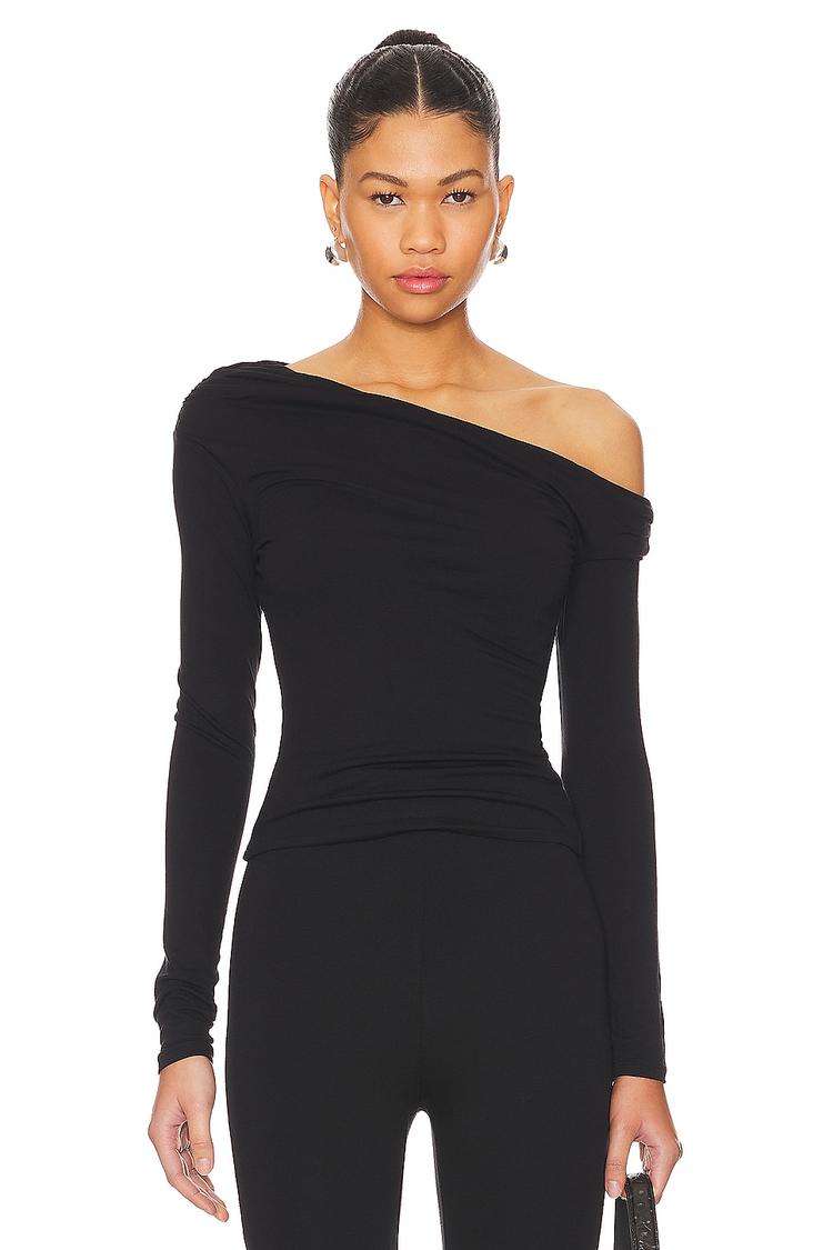 Draped off-shoulder styling and a fitted silhouette highlight this elegant black top crafted in soft rayon-spandex jersey fabric. Its long sleeves and hip length make it versatile for all-weather wear. The minimalist, chic design pairs effortlessly with jeans or tailored pants, making it ideal for casual outings, brunch dates, or everyday wear. The slip-on closure adds comfort and ease, while the off-shoulder neckline lends a subtle, sophisticated charm to your look.