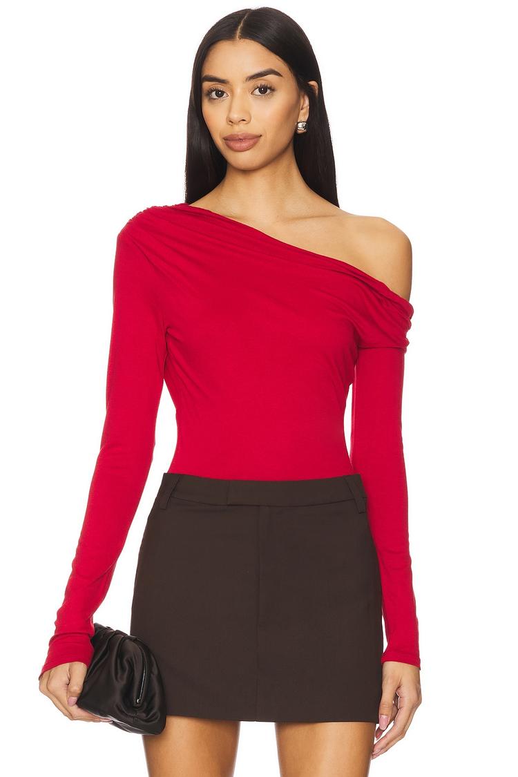 Soft ruffled jersey fabric and a fitted silhouette define this chic off-shoulder top in a striking matte red hue. The long sleeves and waist length combine for a modern, sexy look perfect for casual days, brunch outings, or date nights. Crafted from a comfortable rayon-elastane blend, it offers stretch and breathability while the ruffle detail along the neckline adds a feminine touch. Versatile and flattering, this cropped top is a stylish essential for all-season wear.