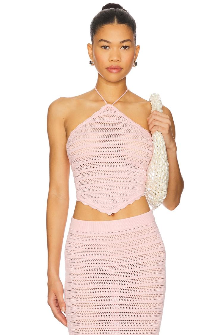 Soft light pink crochet fabric shapes this cropped halterneck top with a slim fit silhouette. Featuring a strapless sleeve styling and a tie-back lace-up closure, it offers a breezy, summery vibe perfect for casual outings, brunch dates, or vacation days. The midweight crochet lends subtle texture and intentional sheerness that pairs effortlessly with minimalist layering. This regular size piece blends bohemian charm with trendy casual chic style, making it an ideal choice for warm weather seasons like spring and summer.