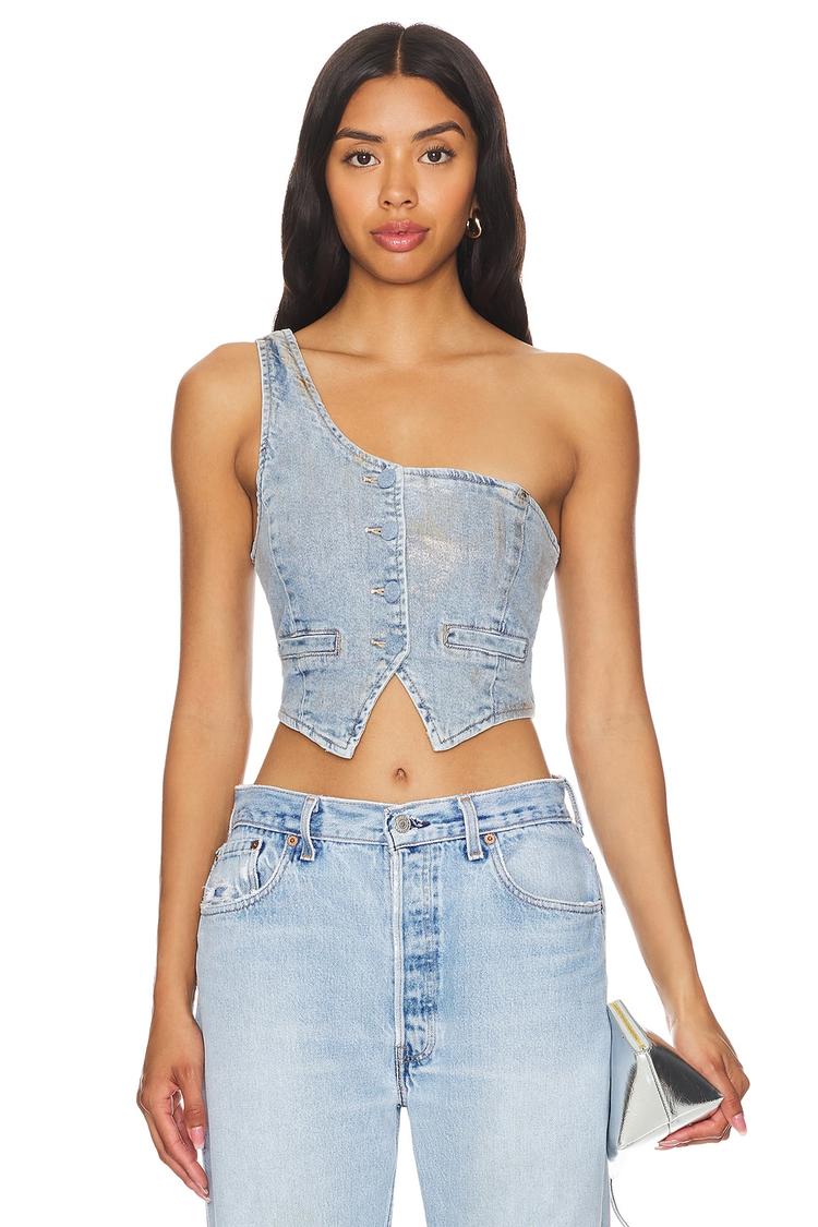 Denim corset with an asymmetric neckline and wide straps offers a chic, fitted silhouette perfect for spring and summer outings. The cropped length and front button closure add modern edge, while subtle gold details elevate the casual style. Ideal for streetwear, brunch dates, or casual gatherings, this piece combines cotton comfort with polyester and elastane stretch for a flattering fit that moves with you.