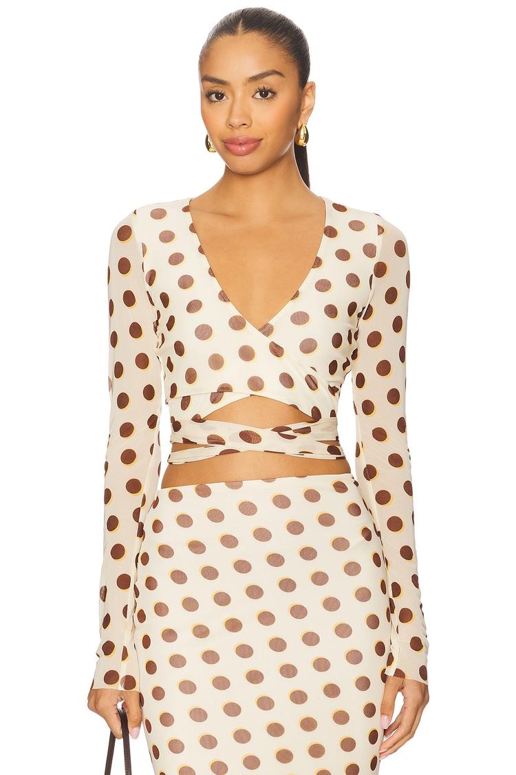 Softly cropped with a flattering wrap design, this fitted top in midweight mesh fabric features a chic V-neck and long sleeves for a modern, trendy silhouette. The cream base is playfully dotted all over with brown polka dots, adding a lively yet elegant touch. Its tie-back closure enhances the tailored fit, making it an ideal pick for casual outings, brunch dates, or night out events during spring, summer, and autumn seasons. Crafted from stretchy polyester and spandex, it offers both comfort and style to elevate any ensemble.