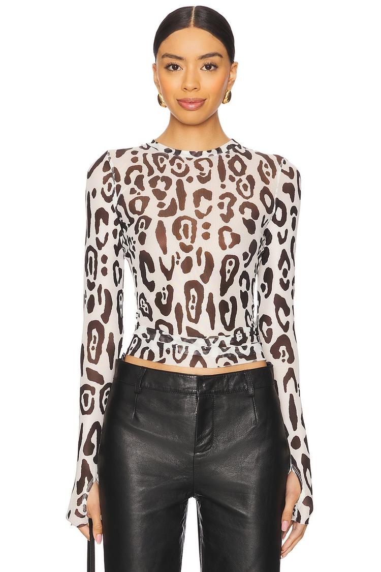 A chic mesh shell top featuring an all-over animal print in beige, brown, and black hues. The fitted silhouette and long regular sleeves with a classic crew neck create a sleek waist-length piece that pairs perfectly with leather or denim for a trendy street style look. Crafted from a stretchy polyester-spandex blend, its sheer fabric adds a daring edge ideal for casual outings, night outs, or brunch dates. This pullover top blends comfort and bold design, making it a versatile choice for fashion-forward wardrobes.