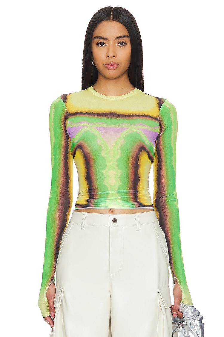 Semi-sheer mesh jersey fabric and thumbhole long sleeves define this slim-fitting shell top, featuring a vibrant abstract pattern in light green, yellow, dusty purple, and brown hues. The crew neck and covered back add to its modern street style appeal. With its waist-length cut and comfortable polyester-spandex blend, this versatile piece fits perfectly for casual outings, streetwear looks, and everyday wear during spring, summer, and autumn. Its unique print and contemporary silhouette make it a trendy essential for those seeking a bold yet wearable statement.