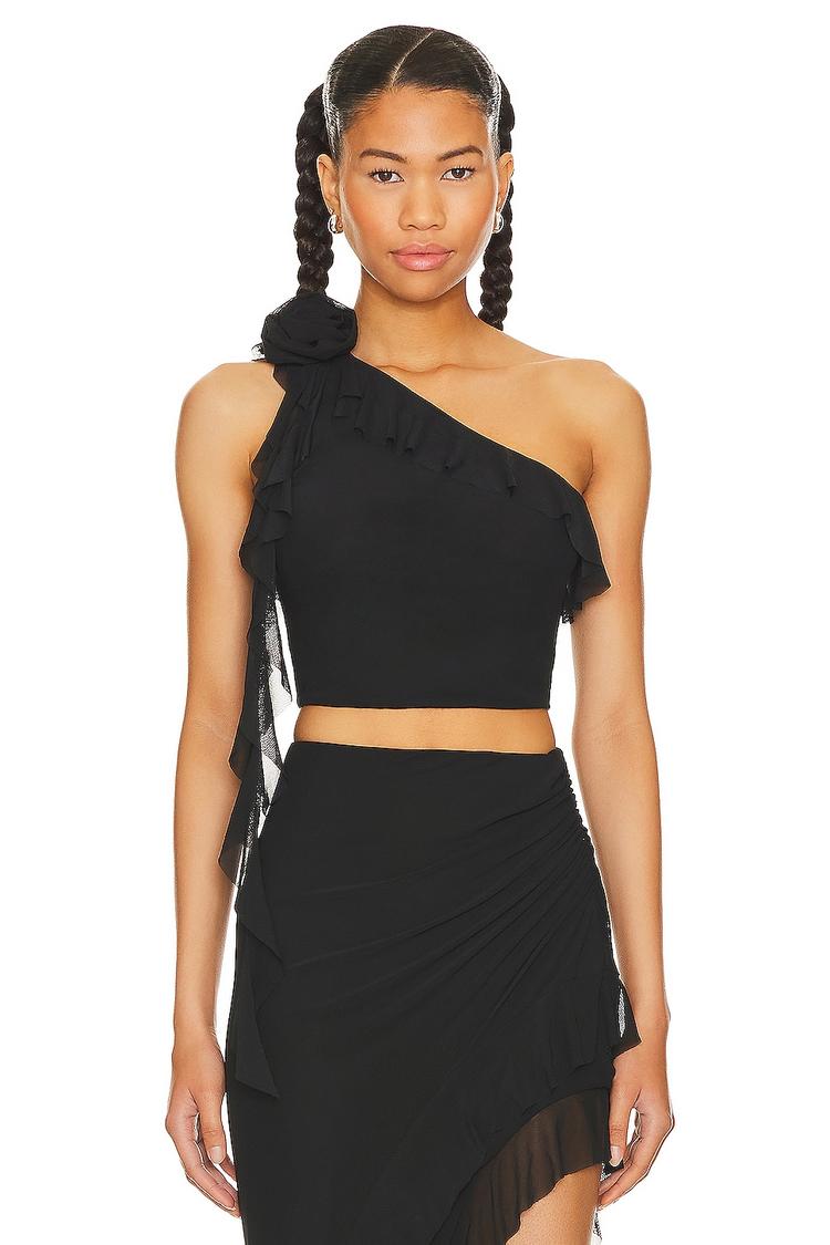 Asymmetric necklines and delicate rosette accents define this fitted cropped top in matte black. Crafted from stretch mesh jersey fabric, it offers comfortable wear with a sleek silhouette. Sleeveless and pullover in style, the top features elegant ruffles and draped fabric details that add a modern, chic edge. Ideal for warm weather, this versatile piece suits casual outings, date nights, and girls' night events, bringing a confident, sexy vibe to your look.