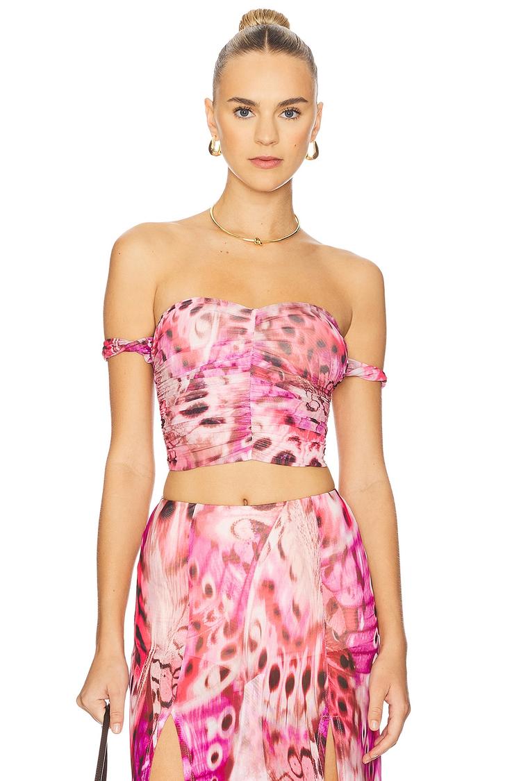Lightweight mesh fabric and a vibrant abstract print define this fitted cropped top with a strapless neckline and off-shoulder sleeves. The pullover design complements its breezy silhouette, perfect for spring and summer days. Its bold pink and beige hues make it an eye-catching choice for casual outings, brunch with friends, or a night out. The sheer mesh texture adds a modern, trendy vibe, bringing a sexy yet playful touch to your warm-weather wardrobe.