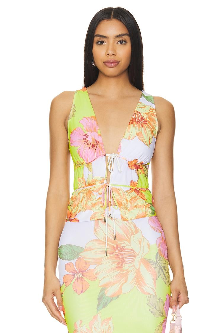 Soft floral prints bloom across this fitted cropped top, crafted from a comfortable polyester-spandex blend that ensures stretch and shape retention. The sleeveless design with wide straps and a plunging V-neckline enhances a summery, bohemian vibe, while the front tie closure adds a playful and adjustable detail. Ideal for casual outings, brunch with friends, or romantic date nights, this versatile top combines seasonal freshness with effortless style.