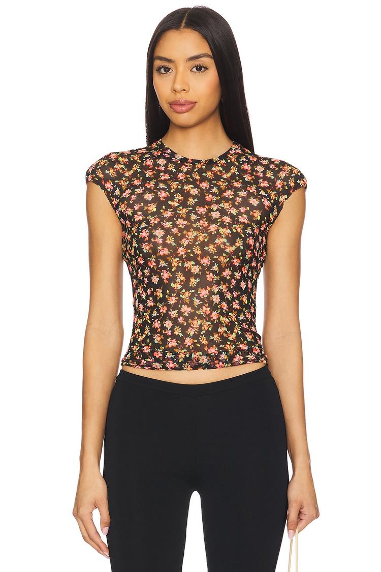 Lightweight mesh in a fitted shell silhouette offers a modern take with a floral print that blooms all over this sleeveless top. The round neckline and cap sleeves frame a sleek, waist-length cut that pairs effortlessly with high-waisted pants for spring and summer outings. Ideal for casual days, brunch dates, or night outs, this sheer piece adds a trendy and chic vibe to your wardrobe while highlighting a subtle dusty rose and green palette on a black base.