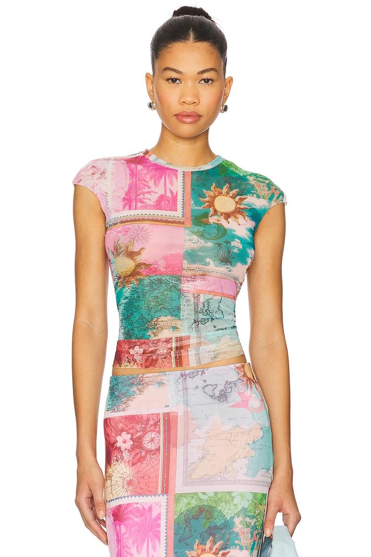 Lightweight mesh fabric and a fitted silhouette define this Nina Shell top, featuring a vibrant patchwork floral print in pink, green, red, blue, and cream hues. The hip length and sleeveless cap sleeves combined with a classic crew neck create a trendy, street-style vibe perfect for spring and summer. Its sheer quality adds a subtle allure, making it ideal for casual outings, brunch dates, or night outs where confident style and breathable comfort are key.