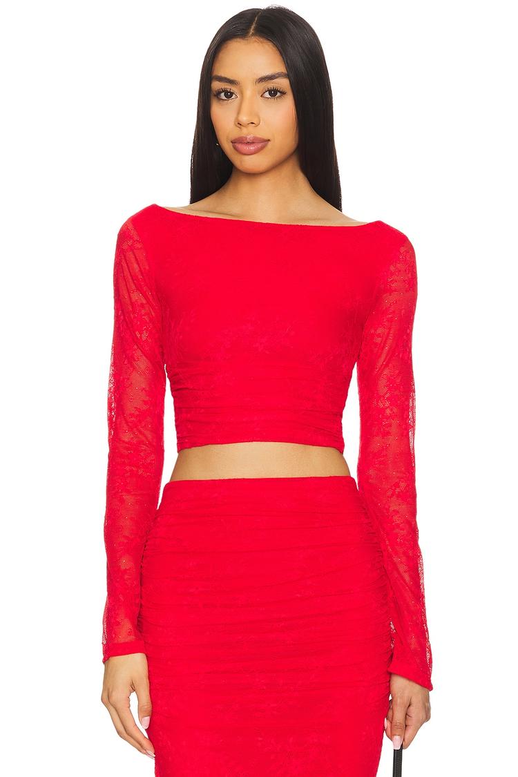 A vibrant red cropped lace top with a fitted silhouette and ruched detailing all over. Crafted from a midweight nylon-spandex blend with polyester lining, it features long regular sleeves and a graceful boat neckline. The delicate lace trim enhances its chic and trendy appeal, perfect for spring to autumn wear. Ideal for casual outings, brunch dates, or night out events, this top combines sexy and sophisticated style with comfortable stretch fabric for a flattering fit.