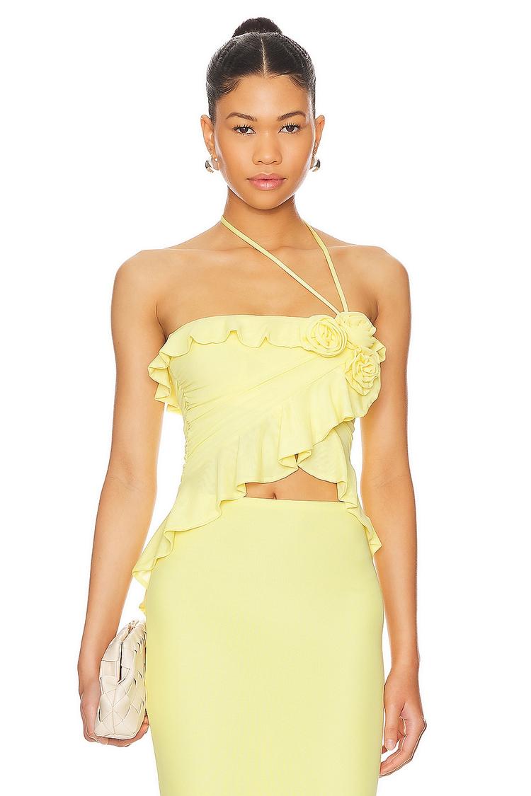 Soft mesh jersey fabric and delicate ruffled trims highlight this fitted cropped top with an asymmetric halter neck and surplice hem featuring hanging fabric details. The light yellow hue and floral accent at the neckline add a fresh, feminine touch. Its tie-back closure ensures an adjustable fit, making it a chic choice for spring and summer outings. Ideal for casual brunches, date nights, or lively girls' nights, this trendy piece pairs effortlessly with high-waisted skirts or pants for a confident, stylish look.