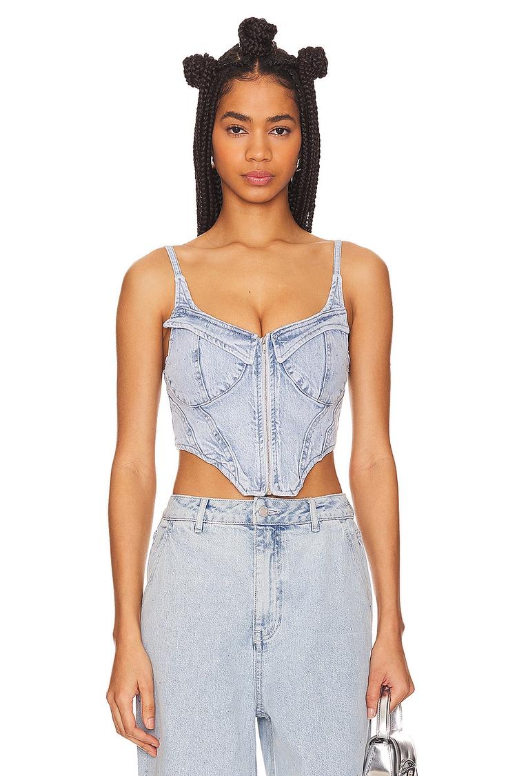 Lightweight crystal-embellished denim brings a modern edge to this fitted cropped corset top featuring a sweetheart neckline and delicate spaghetti straps. The front zipper closure and kerchief hemline add stylish details while the soft cotton blend fabric ensures comfort. Perfect for casual outings, brunch dates, or nights out, this trendy piece pairs effortlessly with high-waisted bottoms for an elevated yet laid-back look during spring and summer seasons.