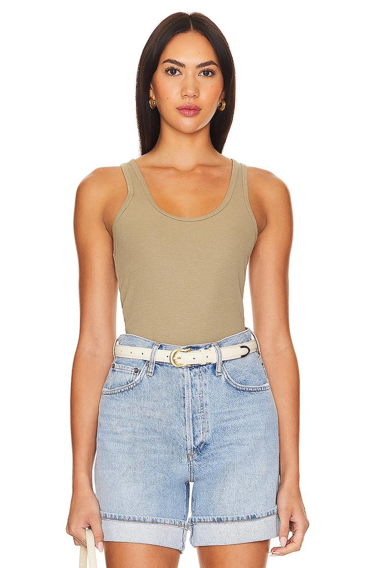 A timeless ribbed-knit tank in a matte tan hue, this fitted tank features a classic scoop neck and wide straps, creating a sleek silhouette that hits at hip length. Crafted from a stretchy lyocell and elastane blend, it offers comfort and breathability ideal for spring and summer wear. Perfect as a standalone piece for casual weekends or layered under an oversized blazer for a polished workwear look, this versatile tank transitions effortlessly from brunch to office settings. Its minimalist design and rib knit texture lend a subtle sophistication to your everyday wardrobe.