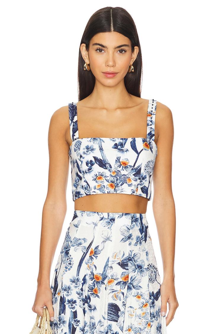 Delicate jacquard fabric meets intricate bead-embellished wide straps in this fitted cropped top, featuring a flattering square neckline and a concealed back zipper closure for a seamless finish. The sleeveless design and all-over floral print in shades of blue and orange on a crisp white base make it perfect for warm spring and summer days. Versatile and chic, it suits casual outings, brunch dates, and vacation wear with ease, offering both style and comfort in a breathable viscose blend.