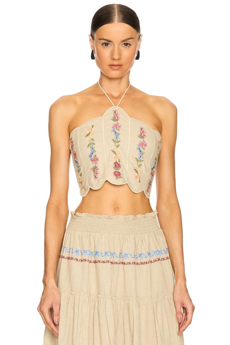 Delicate embroidery in dusty pastels adorns this fitted cropped halter top crafted from a thick cotton-linen blend. The scalloped hem and smocked back panel enhance its bohemian charm, while the tie-back closure offers adjustable comfort. Perfectly suited for spring and summer, this sleeveless piece blends romantic and casual chic styles, making it ideal for beach days, brunches, or vacation outings.