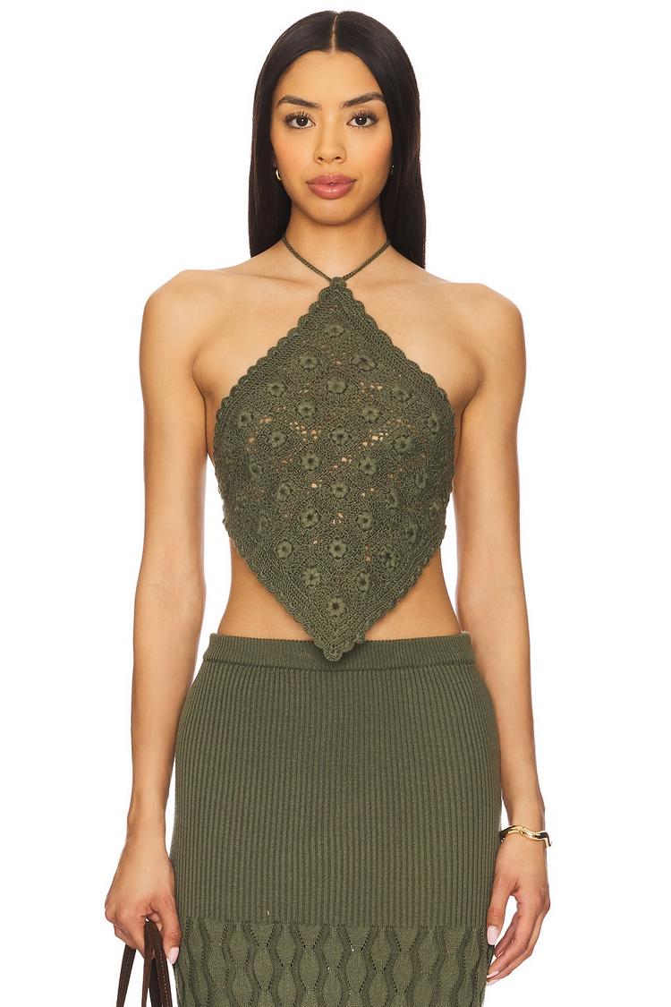 Delicately crafted in a crochet knit, this olive green cropped top features a halter neck and tie-back closure for an adjustable, slim fit. Its strapless sleeve styling and lightweight acrylic-modal fabric blend ensure breathability and comfort, making it ideal for warm weather. Perfectly suited for casual outings, beach days, or brunch with friends, this bohemian-inspired piece brings a trendy yet relaxed vibe to your wardrobe. The all-over crochet design adds texture and visual interest, creating a standout look for your spring and summer wardrobe.