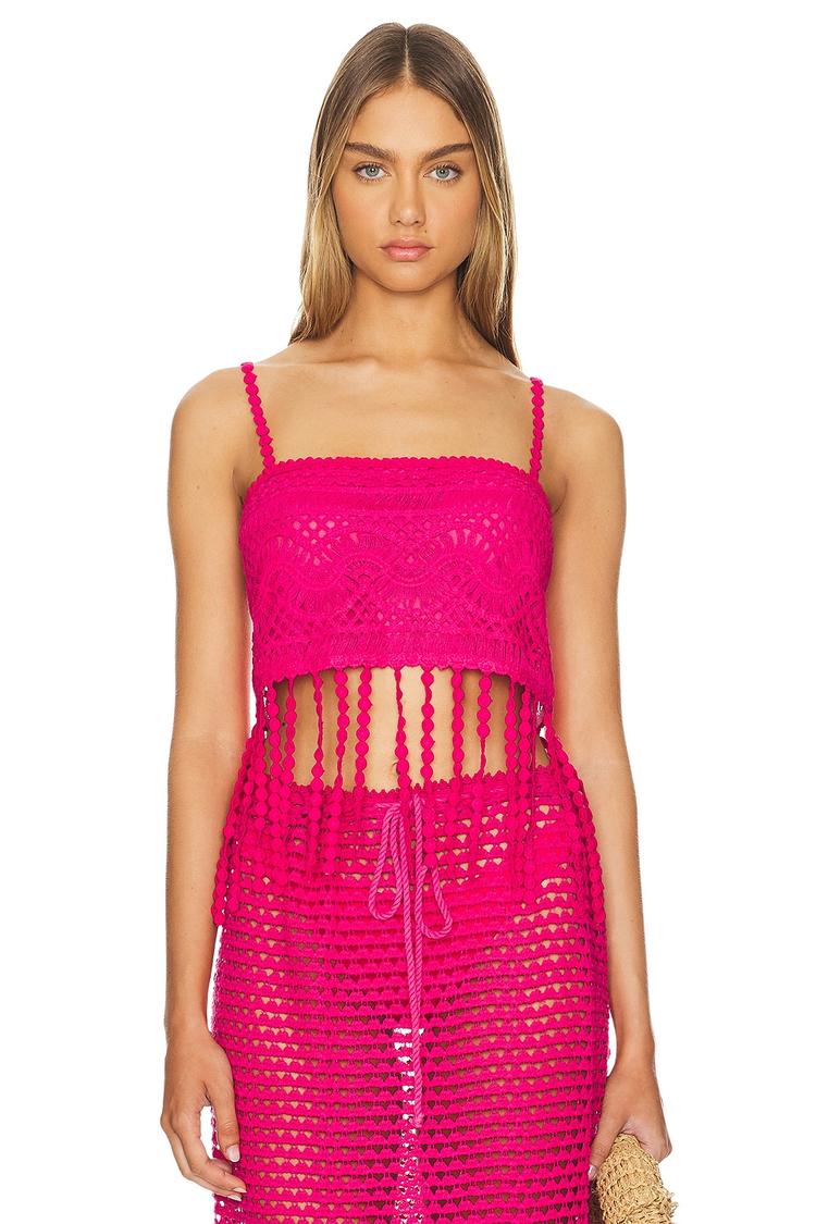 Vibrant fuchsia crochet fabric and delicate fringed hem bring a playful bohemian vibe to this cropped camisole. Featuring a straight neckline and slender spaghetti straps, it offers a relaxed fit that is perfect for warm spring and summer days. The back tie-up closure adds an adjustable touch while enhancing its casual chic style. Lightweight cotton and open crochet weave make this piece ideal for beach outings, vacation escapes, or everyday casual wear. Effortlessly pair it with high-waisted bottoms for a fresh, breezy look.