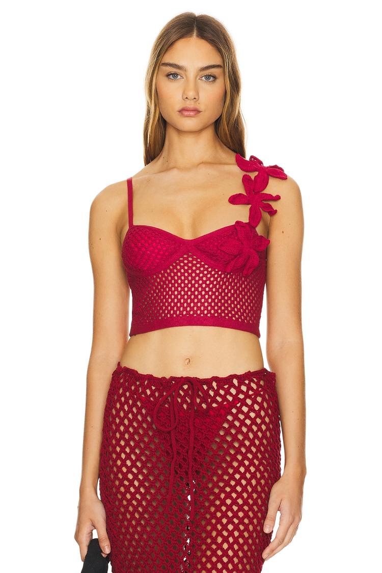 Delicate crochet knit in a vibrant red hue defines this cropped top with a fitted silhouette and sweetheart neckline. Spaghetti straps and a florette applique on the shoulder add a charming bohemian touch, while the back features a stylish tie-up closure enhancing its trendy vibe. Crafted from a lightweight modal blend with polyester and spandex, this semi-sheer top is perfect for warm weather occasions like beach days, casual brunches, and vacation outings. Its flattering cut and intricate details make it a standout piece for effortless summer style.