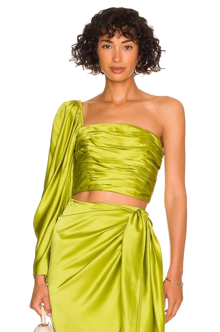 Draped charmeuse fabric with delicate pleating and a boned bodice defines this fitted cropped top in a matte light green hue. The one-shoulder design features a long balloon sleeve adding dramatic flair, while an exposed side zipper ensures a sleek closure. This Pia Top blends sophistication and elegance, perfect for cocktail parties, date nights, and stylish evening outings during spring and summer.