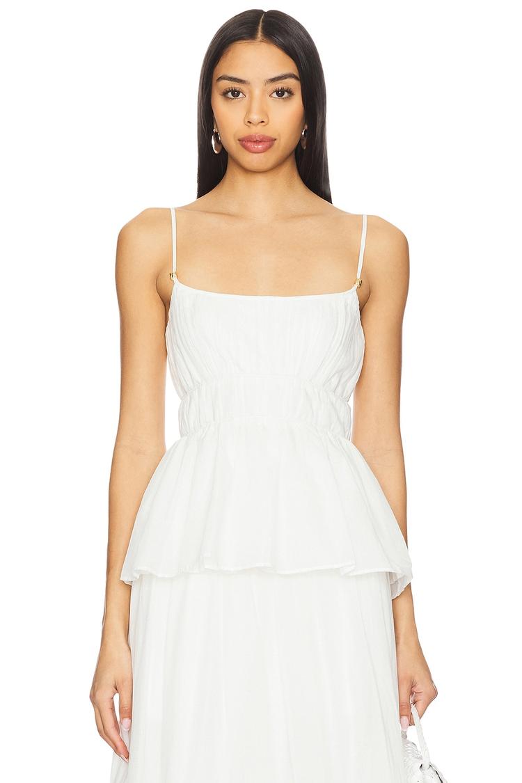 Soft white cotton poplin shapes this peplum cami top with a flattering square neckline and delicate spaghetti straps. The flared waist and subtle ruffle detailing at the hem create a feminine silhouette that pairs perfectly with casual or brunch outings, vacation days, and everyday wear. Adjustable straps and a hidden side zipper with hook closure add both comfort and functionality to this waist-length, sleeveless top. Its minimalist, modern style and breathable fabric make it an essential warm-weather staple for a chic, effortless look.