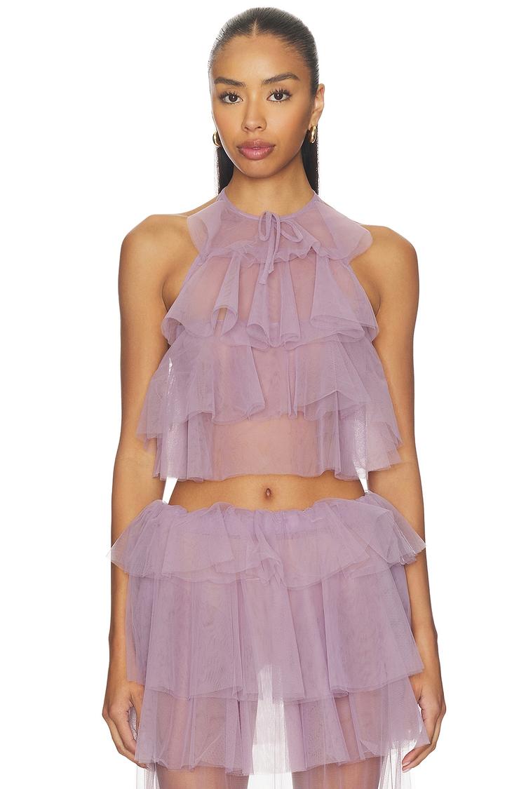 Soft tulle fabric and delicate ruffles create a romantic and trendy camisole with a cropped silhouette. Featuring a halter neck and tie-back closure, this slim-fit top offers a sheer, lightweight feel perfect for warm weather. The all-over layered ruffles add playful texture while the dusty purple hue elevates its chic appeal. Ideal for night outs, brunch dates, or festive parties, this top brings a feminine touch with effortless style.