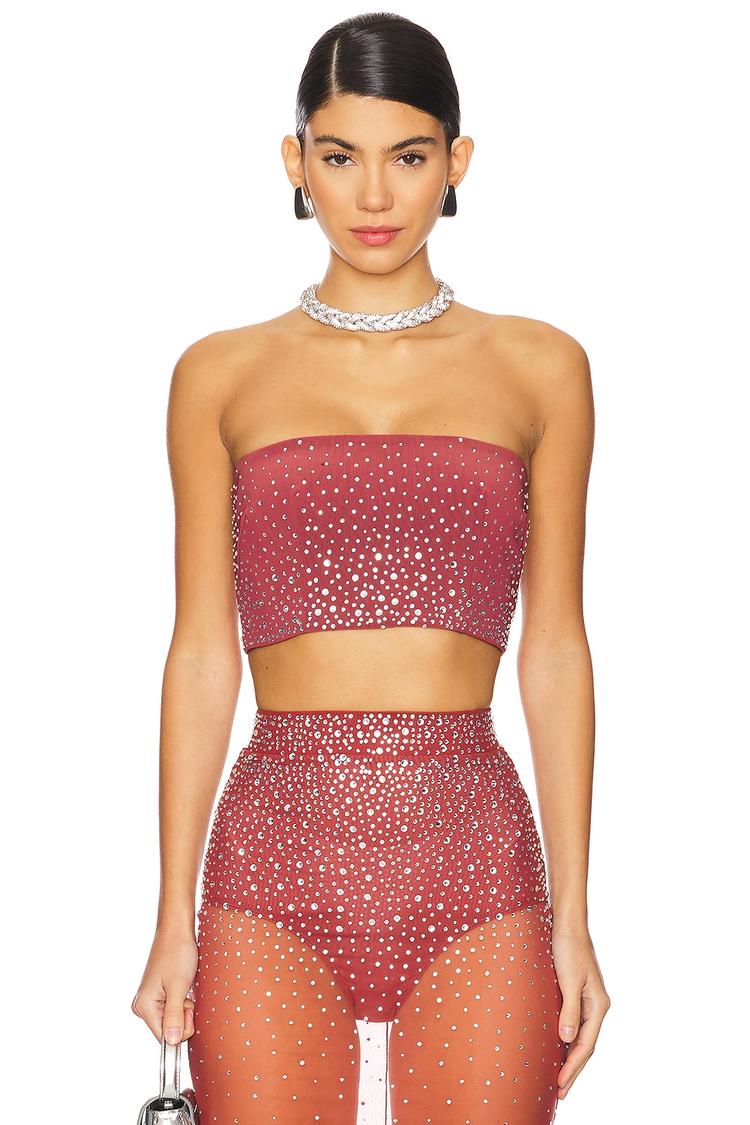 A dazzling display of rhinestone embellishments covers this fitted cropped top in a matte dusty rose hue. Crafted from a stretchy mesh fabric blend of nylon and elastane, it features a strapless straight neckline and sleeveless design, perfect for summer evenings. The exposed back zipper and boned structure add a modern edge and secure fit. Ideal for girls' nights, cocktail parties, and vibrant night outs, this crystal mesh crop top delivers standout glam with an effortlessly chic silhouette.