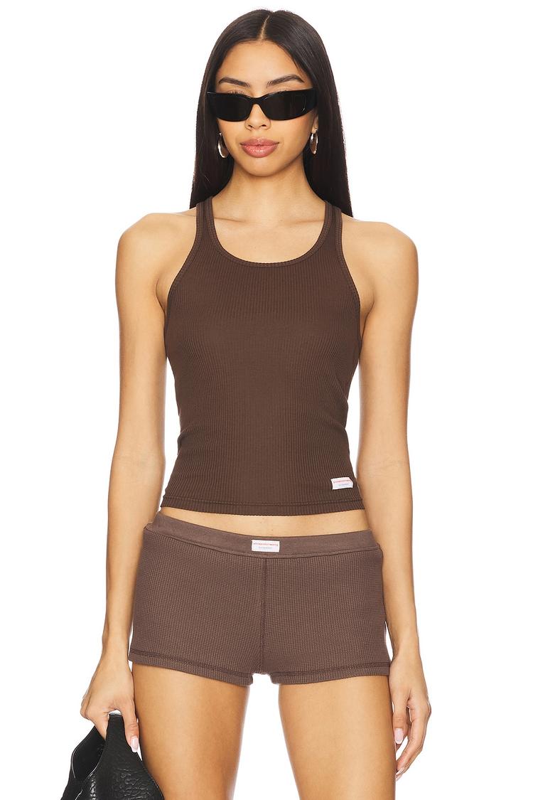 A sleek matte brown racerback tank crafted from a midweight cotton blend, this slim-fit tank features wide straps and a classic round neckline for effortless style and comfort. The waist-length hem ensures a flattering silhouette perfect for layering or solo wear. Its minimalist design and breathable fabric make it an ideal choice for casual outings, loungewear, or everyday wear during spring, summer, and autumn seasons. The pullover closure enhances ease of wear while the subtle front logo detailing adds a touch of understated brand appeal.
