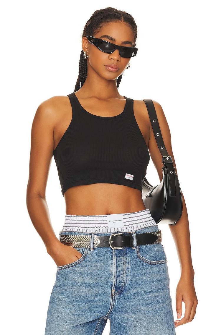 Crisp cotton jersey and a fitted silhouette define this classic cropped racer tank, perfect for warm days. Featuring a crew neck and wide straps, its racerback style offers a sporty edge while ensuring comfort. The ribbed texture adds subtle detail to its minimalist black design. Ideal for casual outings, streetwear vibes, or light workouts, this tank blends functionality with effortless style. Pair it with high-waisted jeans or activewear for versatile looks that suit spring and summer seasons.
